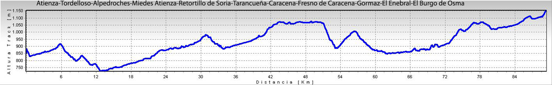 Eran las 8 h 30’ cuando dejábamos a Atienza a nuestras espaldas. Salimos por la carretera CM 110 y por ella seguimos hasta encontrar el cruce con la CM 1005 que nos conduce a Alpedroches y Miedes de Atienza. Miedes, conserva aún vestigios de pueblo señorial. La carretera, a pesar de alguna bajada, no para subir, pero será a partir de Miedes, que está a 1149 m de altura, cuando el puerto de la Pela comienza en serio, se sube hasta los 1400 m ya en los límites de la provincia de Soria. El puerto de la Pela, no se hace pesado, no tiene grandes rampas. En la entrada a la provincia de Soria la carretera CM 1005 se convierte en la SO-161( la señal indicadora de la carretera pone SO-160)y será el punto en donde comienza a perder nivel. En bajada, pronto llegas a Retortillo de Soria. Paramos, y damos una vuelta por él. El pueblo aunque pequeño, es bonito. En Retortillo nos dividimos en dos grupos. El formado por Manel, Xarli, Lluís y Bernat, que deciden seguir por Tarancueña y Caracena hacia el Burgo de Osma (se hacen 30 km mas) y Juan que decide seguir por la SO-161, hasta El Burgo de Osma. Para continuar por Tarancueña hay que seguir por la carretera comarcal SO-V-1006 y superada Tarancueña se sigue por la misma hasta el cruce con SO-V-1927 que al poco rato se deja para seguir por una senda ciclable, la Majada Blanca, que nos conducirá hasta Caracena.